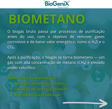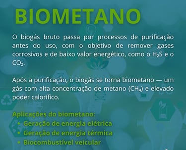Após a purificação, o biogás se torna biometano — um gás com alta concentração de metano (CH₄) e elevado poder calorífico.