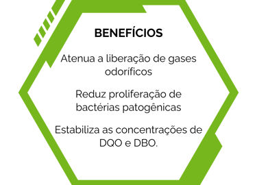 Pode ser aplicado em Lagoas de Estabilização, Reatores anaeróbios, Lodo ativado, Tanques aeróbios, Fossas e Caixas de gordura.